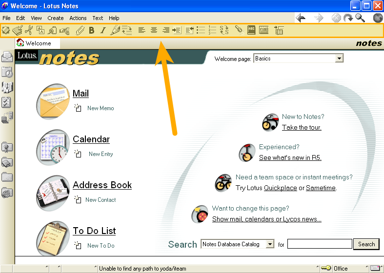 Notes 5 brought several new features to the table, the 'Tabbed' user interface for handling multiple 'windows' (oh yes, [Ctrl]+[Tab] worked back then), the Bookmark Bar, a new browser-style interface (including some WONDERFUL navigation tools which were removed in the Eclipse based client beginning with Notes 8), Framesets, Outlines and Pages to help give a 'modern' layout to existing Notes databases and a funky new green tinge to the Mail, Calendar and To-Do list.