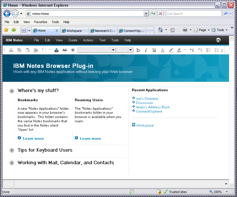 Figure 2: The IBM Notes 9 browser plug-in workspace