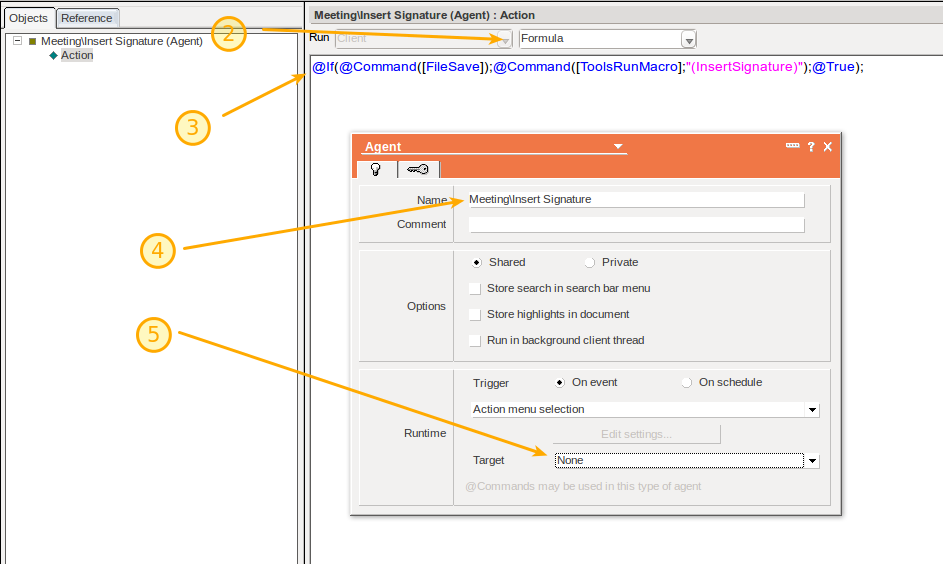 The only thing about running this agent is that it's set to be activated from the Agent list (that's a design property), so it's not that easy to get to, and there isn't an easy option in the User Interface that would enable you to run it. Thankfully - as long as you have Designer access to your mail database - all you need to do is create another agent that triggers the "(InsertSignature)" agent, which is a fairly simple process, and the neat thing; you can still do this even if you don't have Domino Designer installed: