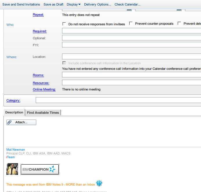A couple of weeks ago Russ Maher flicked me a question via twitter whether it was possible to include a Lotus Notes mail signature in a Meeting Invitation.Well, of course it is! It's Notes, and Notes can do anything! :-)
