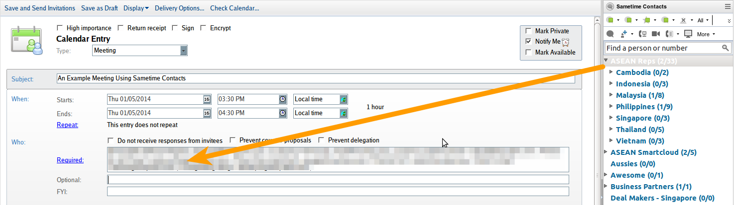 This time, we're going to drag in the other direction, from a Sametime contact group, into the address line of the document you are working with. My example below is a Meeting Invitation, but it could just as easily be an Email message or a Group To-Do: