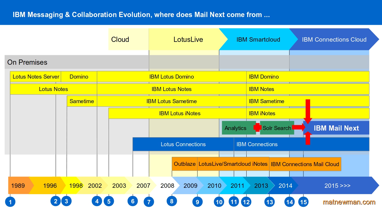 | 15 | 2015 The convergence of Messaging & Collaboration and Enterprise Social platforms, backed by powerful Analytics capabilities, and tightly integrated Search, IBM's Mail.Next interface is released for General Availability. |